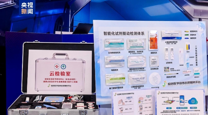 现场,“蔚蓝守护”“天际驰援”“生命速递”等五大场景集中呈现,综合运用实物模型和虚拟交互技术,从预警,救援,后送,救治,康复展现应急医学救援全链条。在“生命速递”场景,一个“便携式云检验箱”格外引人关注,在15分钟内就可以完成包括常规血液,传染病以及心脑血管疾病在内的300多项检测,除了应急医学救援场景外,还可以用在社区,学校,乡村以及航天等领域。
